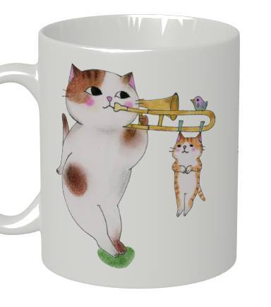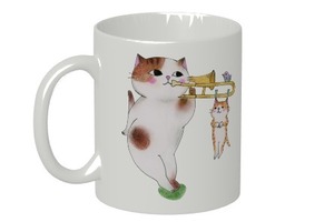 トロンボーンと猫の絵柄がプリントされたマグカップです。